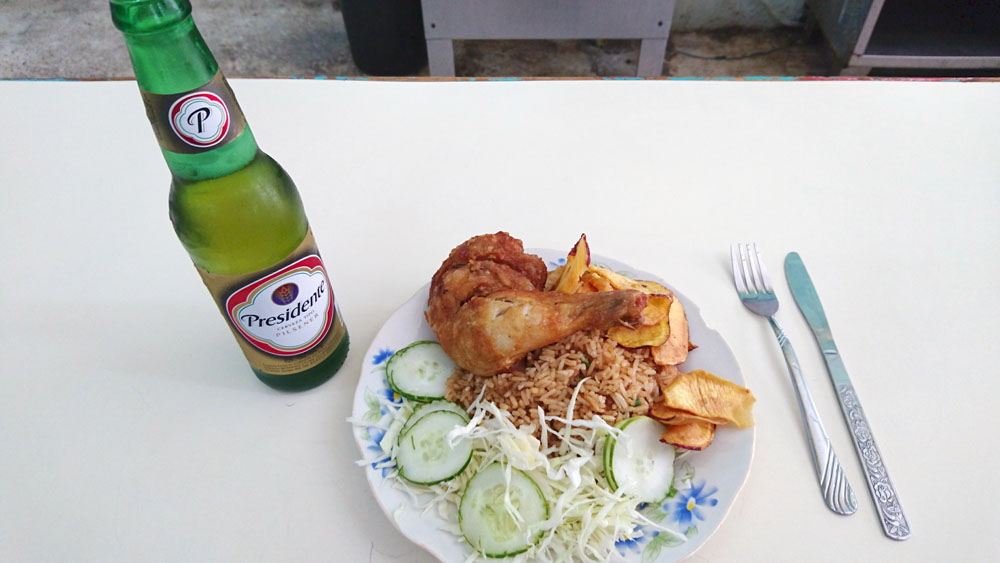 昼食は食堂でフライドチキン・サフランライス・バナナチップス・野菜のセット。ここの食堂はこのメニュー1品のみ。ビールをつけると300円ほどになる。支払いは人民ペソで、観光客向きではなく地元の人々が多く集まる。他にもジュース売り場やサンドイッチ売り場などがある。