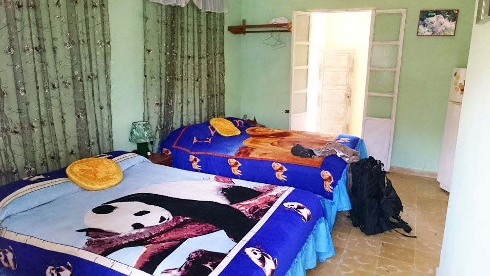 部屋の中。パンダとライオン。冷蔵庫やエアコンもついている。食事付きで一泊30CUC。シャワーは水しか出ないが、この季節は気温が高いので許せる範囲。