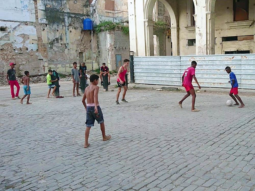 キューバでは野球に劣らず、サッカー人気も高い。少年たちはよく路上でボールを蹴っている。